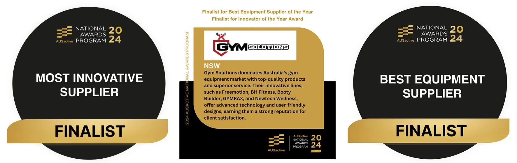 We are thrilled to announce that Gym Solutions has been nominated as a finalist for Best Equipment Supplier of the Year and Innovator of the Year at the 2024 AUSactive National Awards!