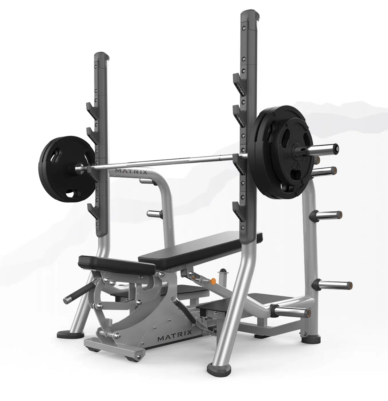 The Magnum 3-way Olympic Bench accommodates flat bench press, incline press and shoulder press with simple adjustments. The seat automatically moves into the proper position when the back is adjusted. Molded urethane guards protect Olympic bars from damage, reduce noise and provide a hand rest for spotters. A total of 10 weight-storage horns offers ample storage for 454 kg / 1,000 lbs. of Olympic plates. The frame features a proprietary two-coat powder finish for long-lasting durability.