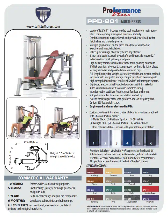 TuffStuff’s Proformance Plus Multi Press (PPD-801) combines the three best upper body pressing movements into a single space-saving commercial unit. The multi purpose bench and press bar easily adjust for flat, incline and shoulder presses. The multi-grip handles allow you to add even more variety to each pressing exercise with either a traditional pronated pressing grip (like you would grip a straight bar to press) or a parallel grip (palms facing each other as if you were going to clap). The parallel grip, or “neutral” grip, distributes stress on the muscles slightly differently and is often less stressful to the shoulder joints and pectoral attachments. By enabling you to vary both the bench angle and your hand placement, the Proformance Plus Multi Press will be one of the most versatile pieces of equipment in your training arsenal.