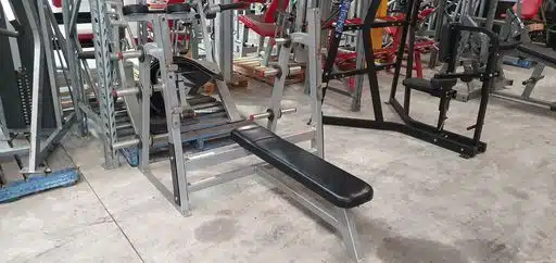 Star Trac Olympic Flat Bench with built in weight storage. It can be completely unassembled for easy transportation or moving through the doors with limited access. This is a heavy duty commercial bench, very well built bench. Silver frame with black upholstery.