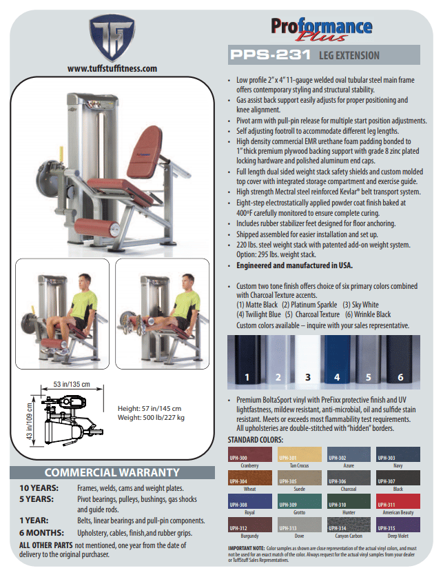 TuffStuff’s Proformance Leg Extension (PPS-231) is fantastic for developing strong quadriceps muscles. Simple to use with great design, the leg extension includes a self-adjusting foot roll to accommodate different leg lengths. Many other manufacturers use pop-pin adjusted foot rolls; which adds another required adjustment prior to use, and feels less natural at full extension.